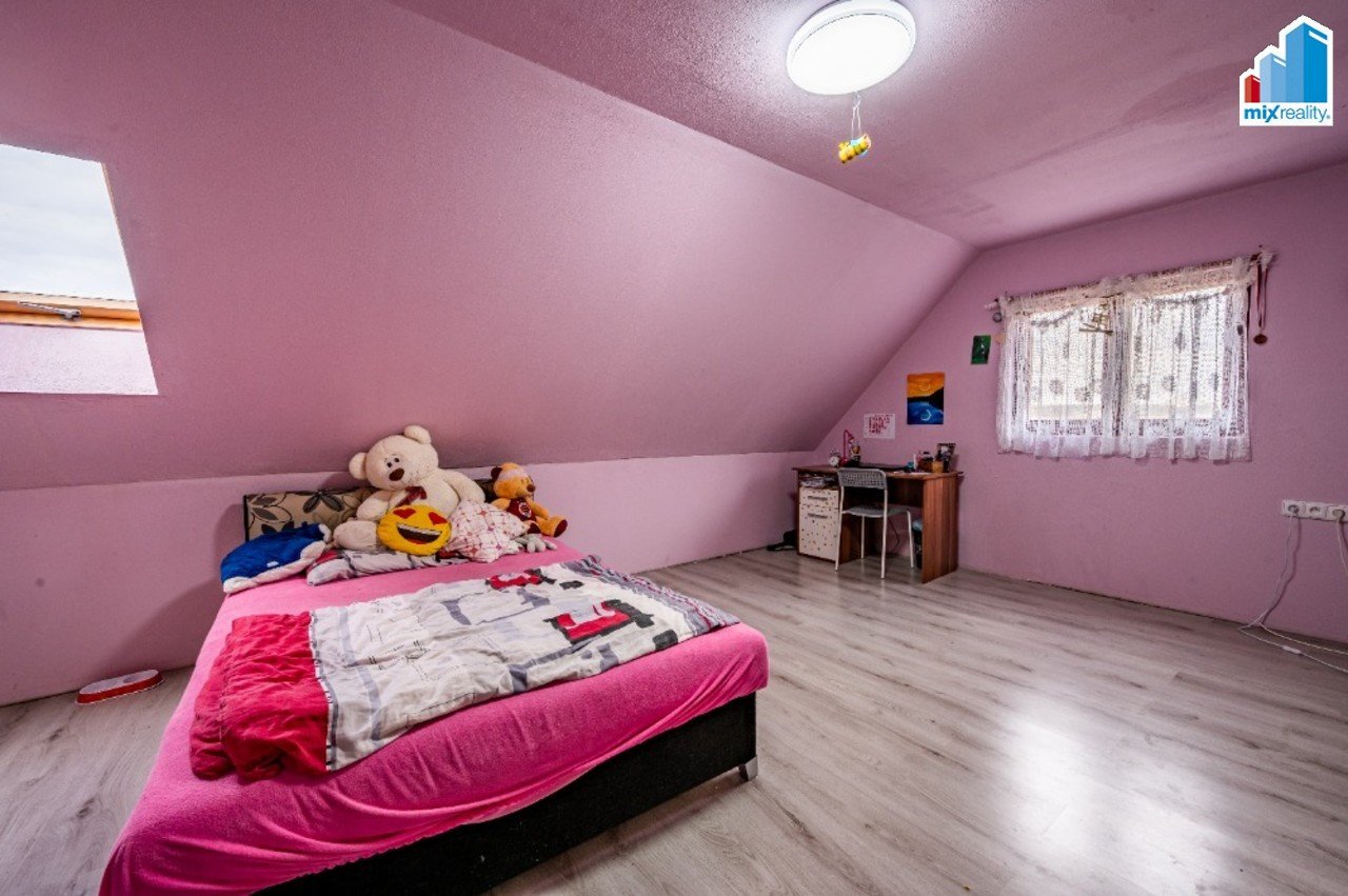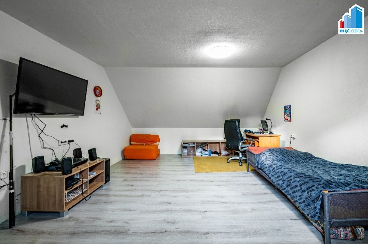 V podkroví jsou dva samostatné pokoje, další obytný prostor vhodný jako pracovna či pokoj pro hosty a koupelna s WC před dokončením.