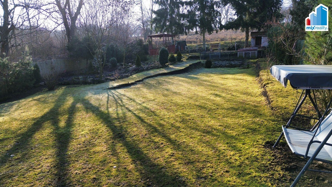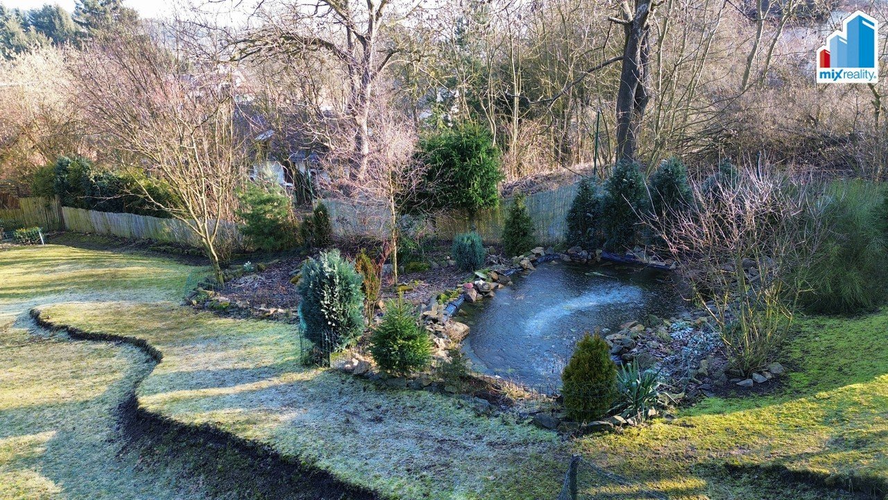 Na dům navazuje kryté posezení vhodné pro grilování. V zadní části zahrady se nachází altán, jezírko a připravený prostor pro budoucí bazén. Zahrada je osázena vzrostlými stromy, okrasnými keři a květinami a nabízí dostatek soukromí i prostoru pro relaxaci.